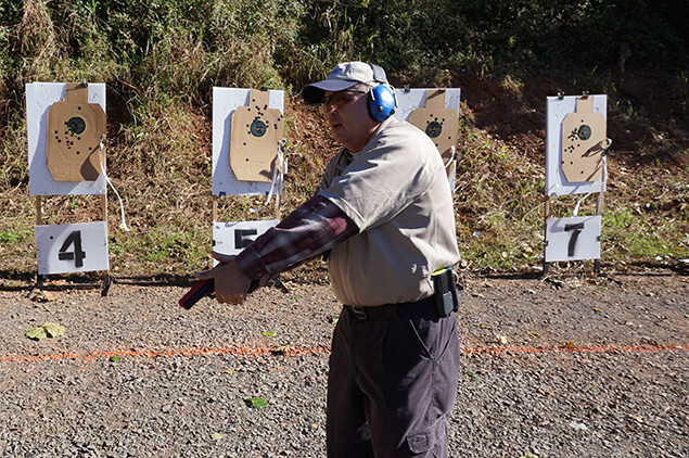 Defensive Pistol Skills is all about 0-5 yard shooting and drawing from concealment – teaching specific skills that you’d use to survive a close-range gunfight. In that course we don’t fix any problems with grip and stance – there’s no time allotted in the course for it. Students shoot multiple targets but they are at the same distance.